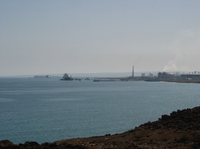 | Das Abenteuer beginnt | Am Horizont der Erdgashafen | Links neben der Moschee beginnt der Track | |