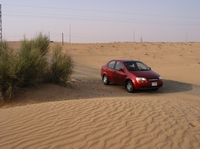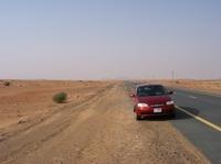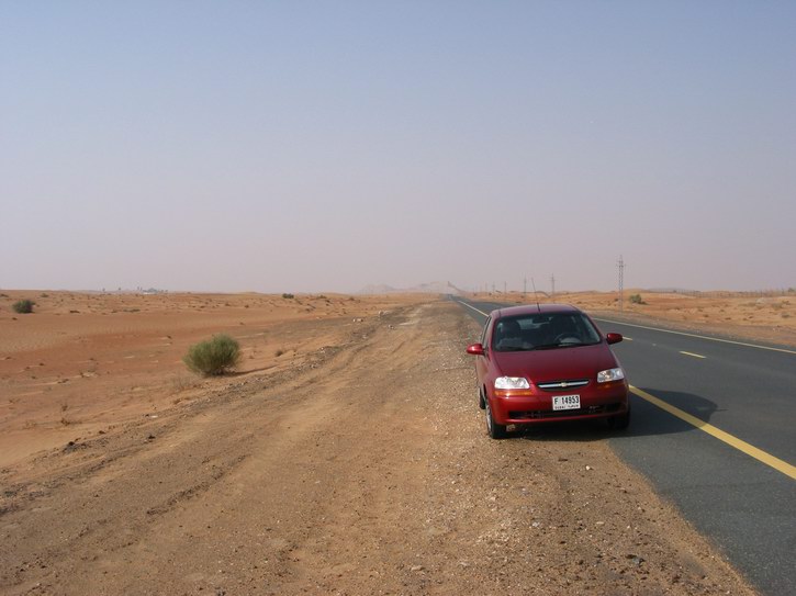 | Kleines Auto allein in der Wüste | Sand bis zum Horizont | Einsames Grün in der Wüste | |